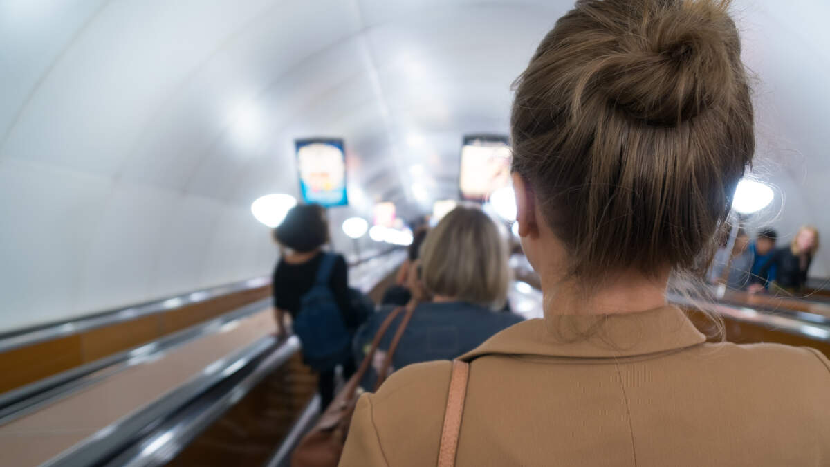Tilted Escalator Riders in Budapest