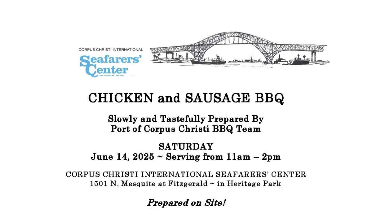 Please join the Corpus Christi International Seafarers' Center for their annual "HEB Chicken & Sausage BBQ" on Saturday, June 14, serving from 11:00 a.m. to 2:00 p.m.