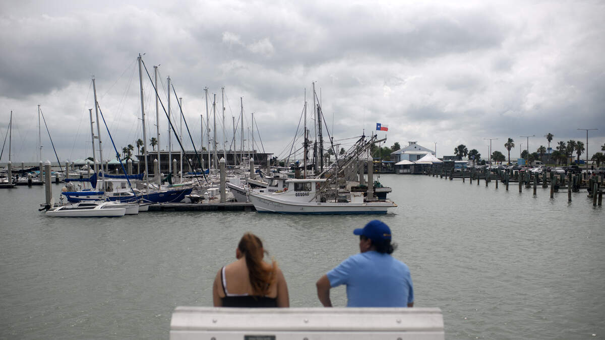 People sit near a marina ahead of the arrival of Tropical Storm Beryl in Corpus Christi, Texas on July 7, 2024. Beryl weakened to a tropical storm on July 5 after hitting Mexico as a Category 2 hurricane, with fierce winds causing material damage but no injuries along the touristic Yucatan Peninsula. Now headed for the Gulf of Mexico, Beryl is expected to intensify as it moves toward northeastern Mexico and the US state of Texas by the end of the weekend, according to the Miami-based National Hurricane Center (NHC). (Photo by Mark Felix / AFP) (Photo by MARK FELIX/AFP via Getty Images)Photo: MARK FELIX / AFP / Getty Images